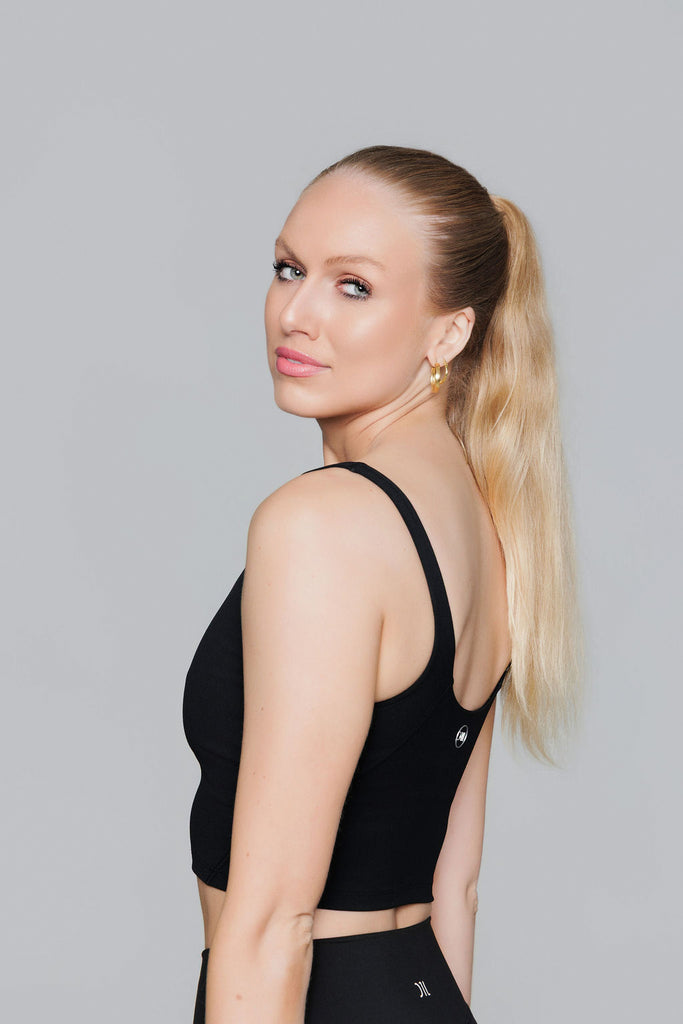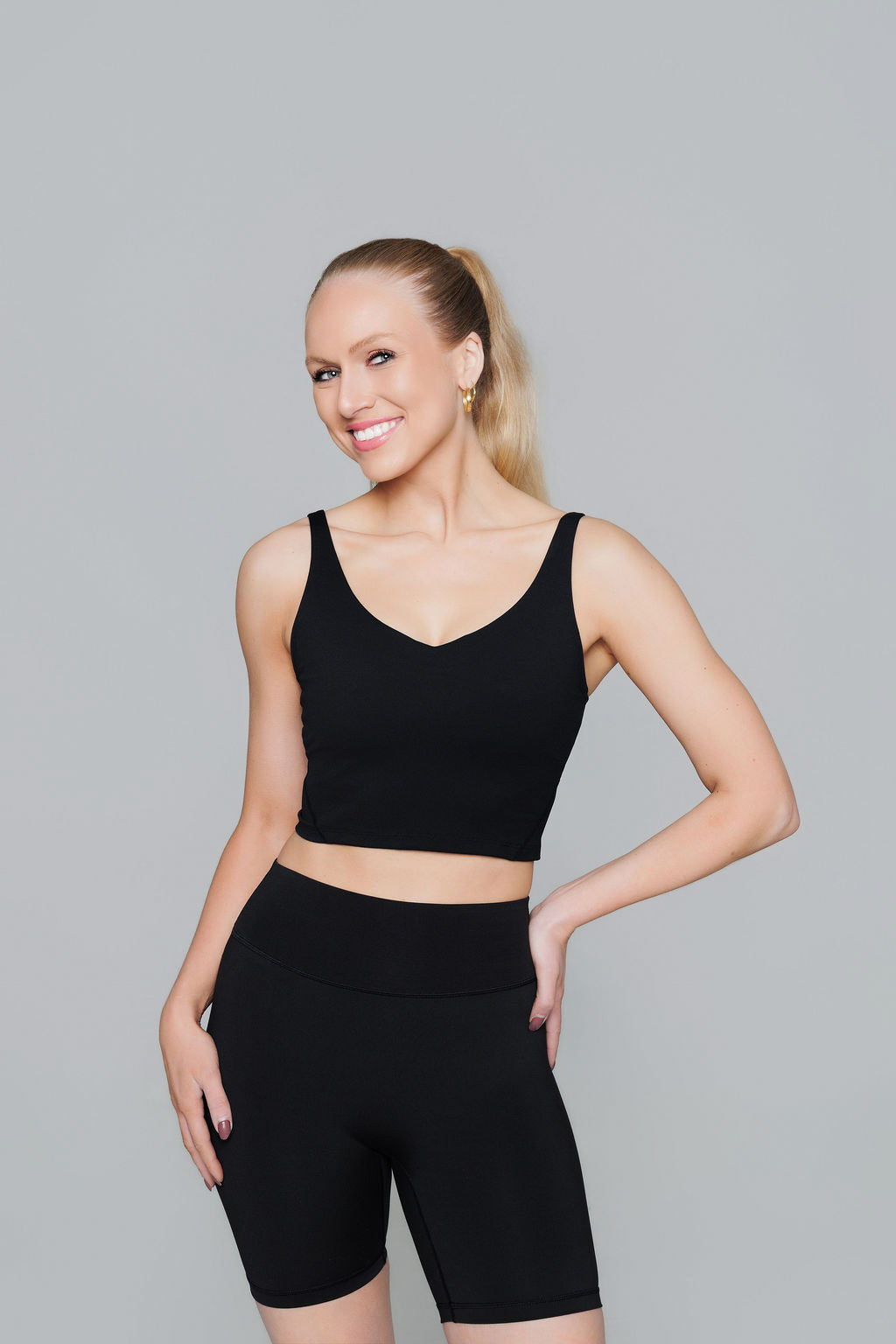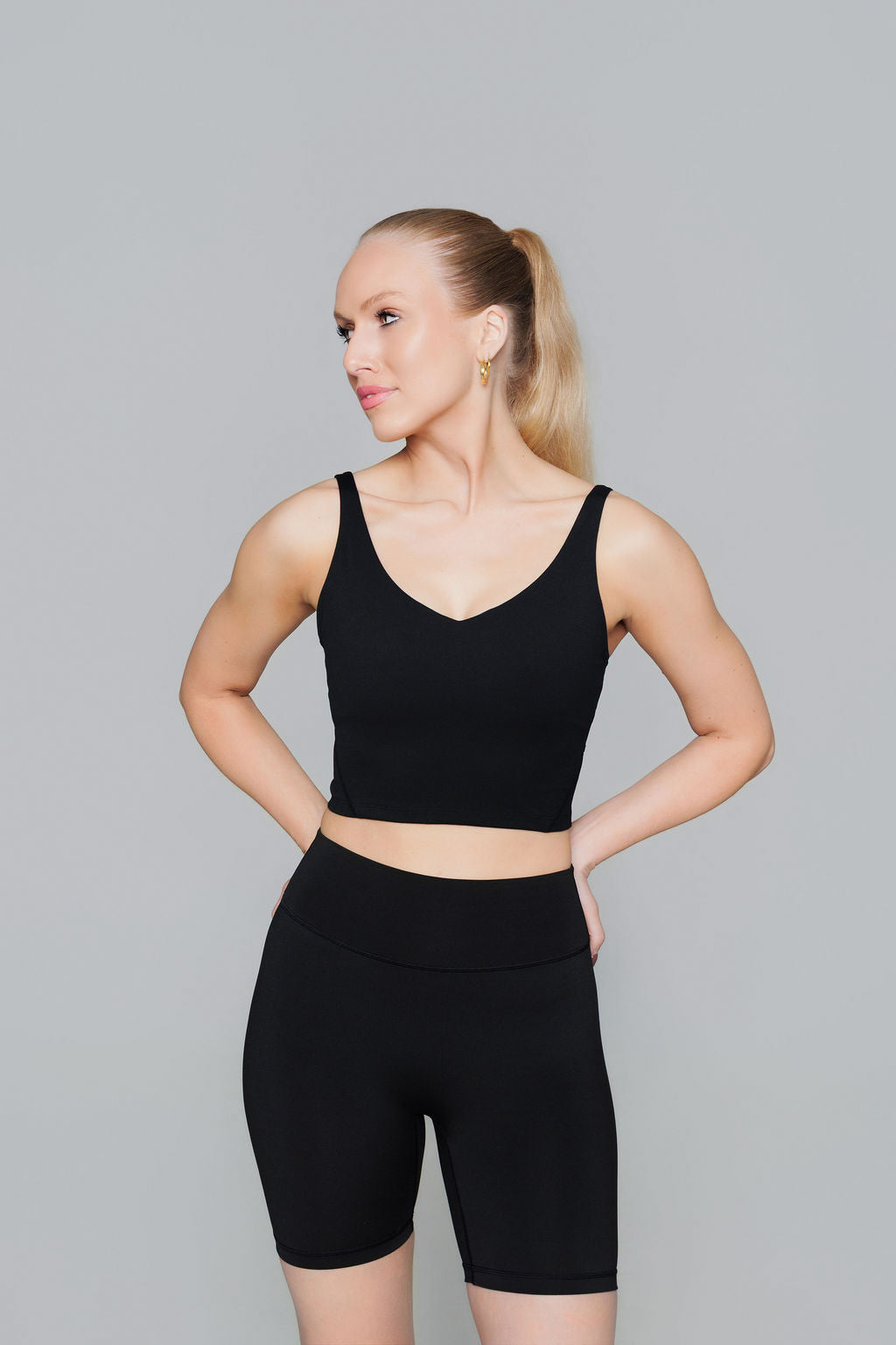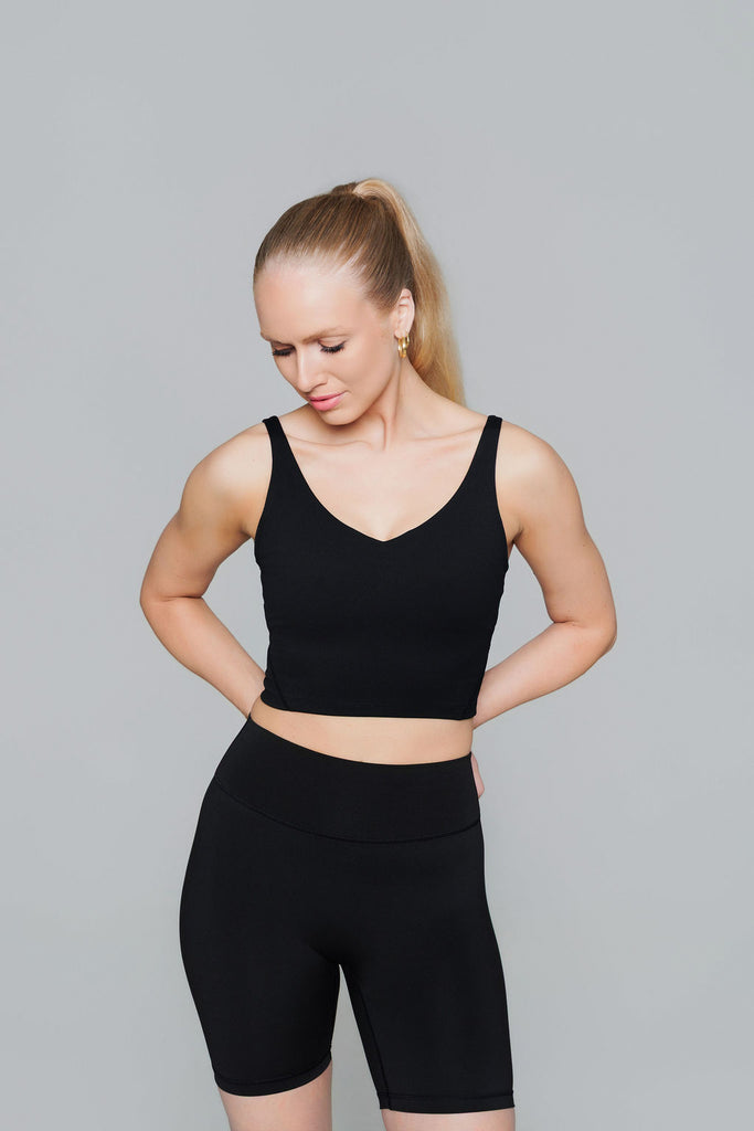 Our Black Crop Top is perfect for workout or as everyday wear. Great fit, medium support and removeable pads. We recommend you take your usual size.