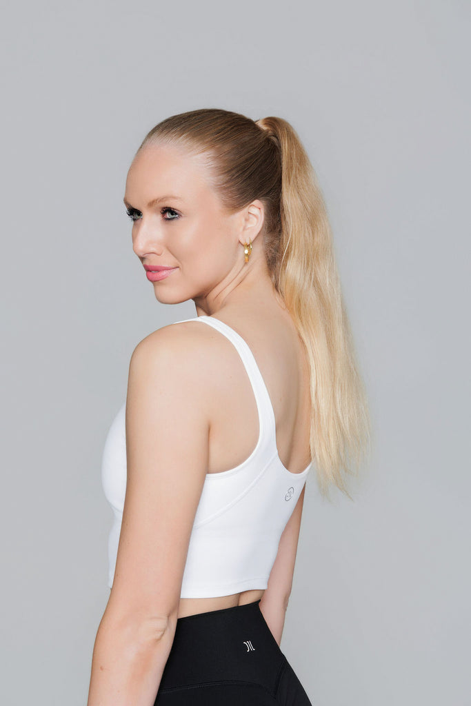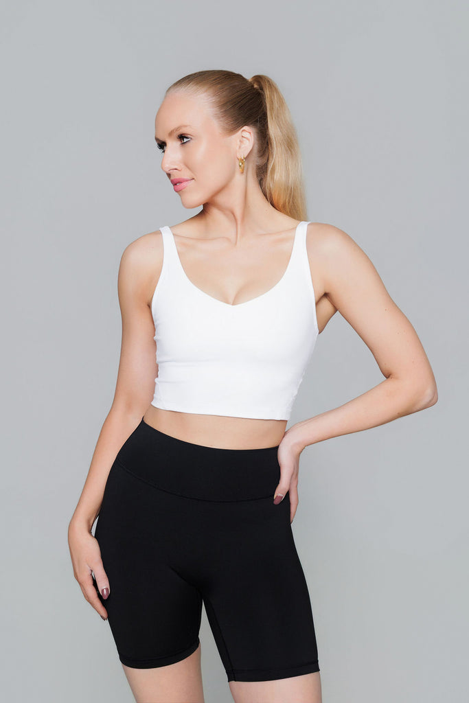 Our White Crop Top is perfect for workout or as everyday wear. Great fit, medium support and removable pads. We recommend you take your usual size.